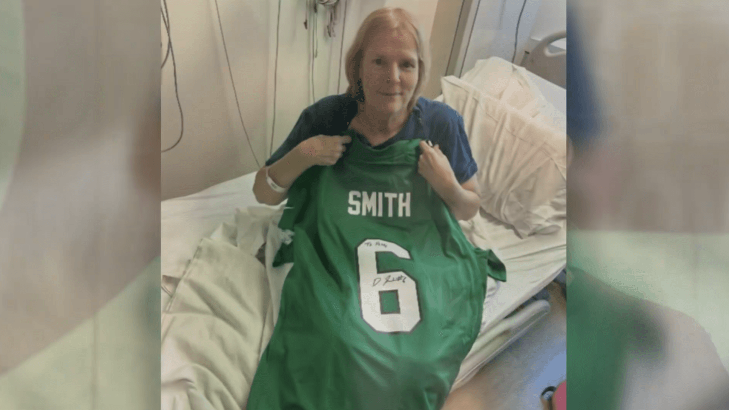 Lately, Pat hasn’t stopped talking about one player in particular: Eagles wide receiver DeVonta Smith. During one difficult chemo day, she scrolled through reels, smiling at Smith’s game-day outfits. That moment sparked an idea—Theresa’s roommate suggested she reach out to Smith’s fiancée, Mya.