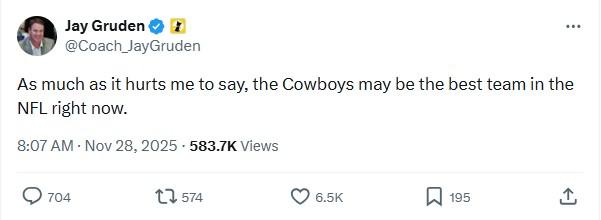 Gruden’s short but seismic post on X immediately lit up timelines across the football world. The content wasn’t shocking—Dallas has been rolling. The source, however, was. For years, Gruden had been a central figure in one of the NFL’s fiercest rivalries, guiding Washington against their bitter NFC East adversary. His public praise carries a sting that ordinary analysis simply can’t match.