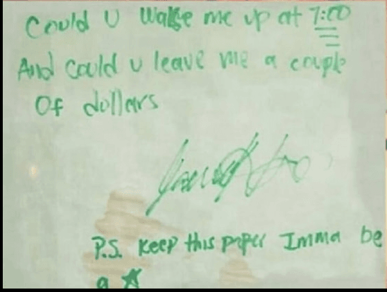 "Mom, Could you wake me up at 7 a.m. and could you leave me a couple dollars? Keep this paper, Imma be a star."